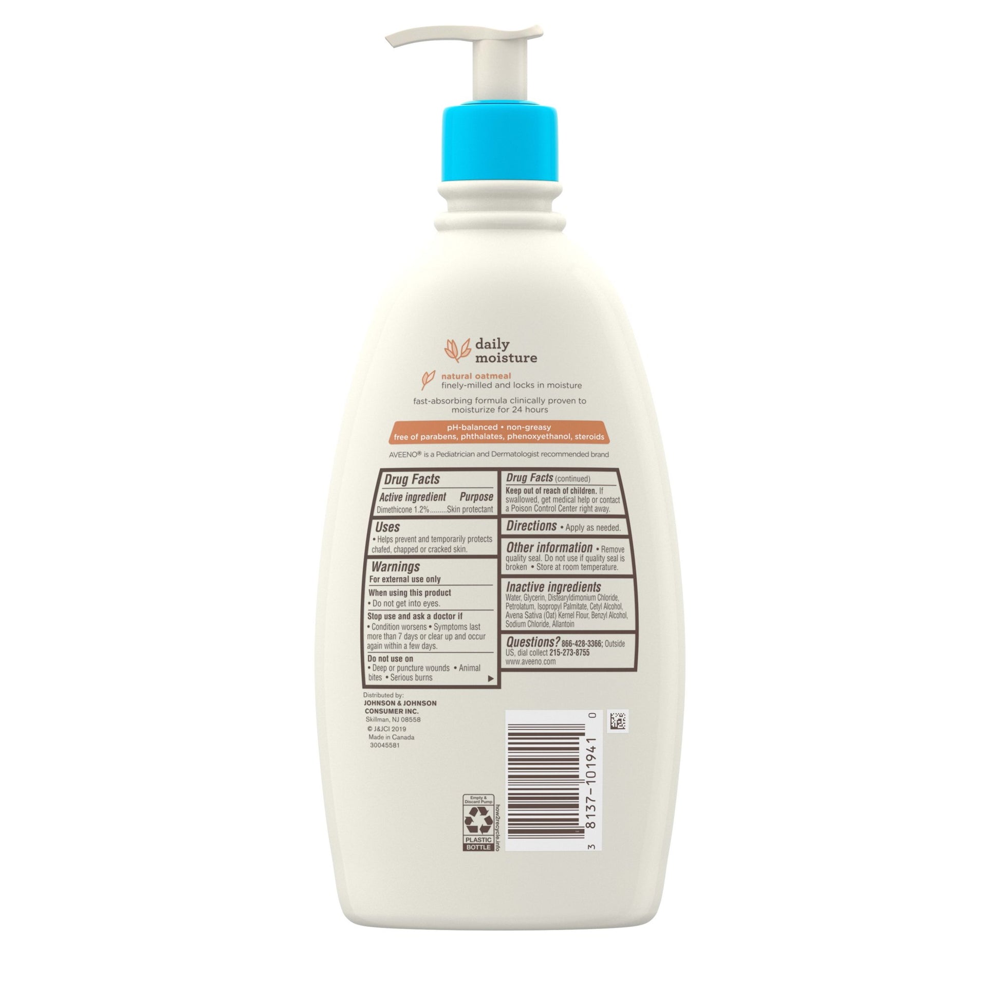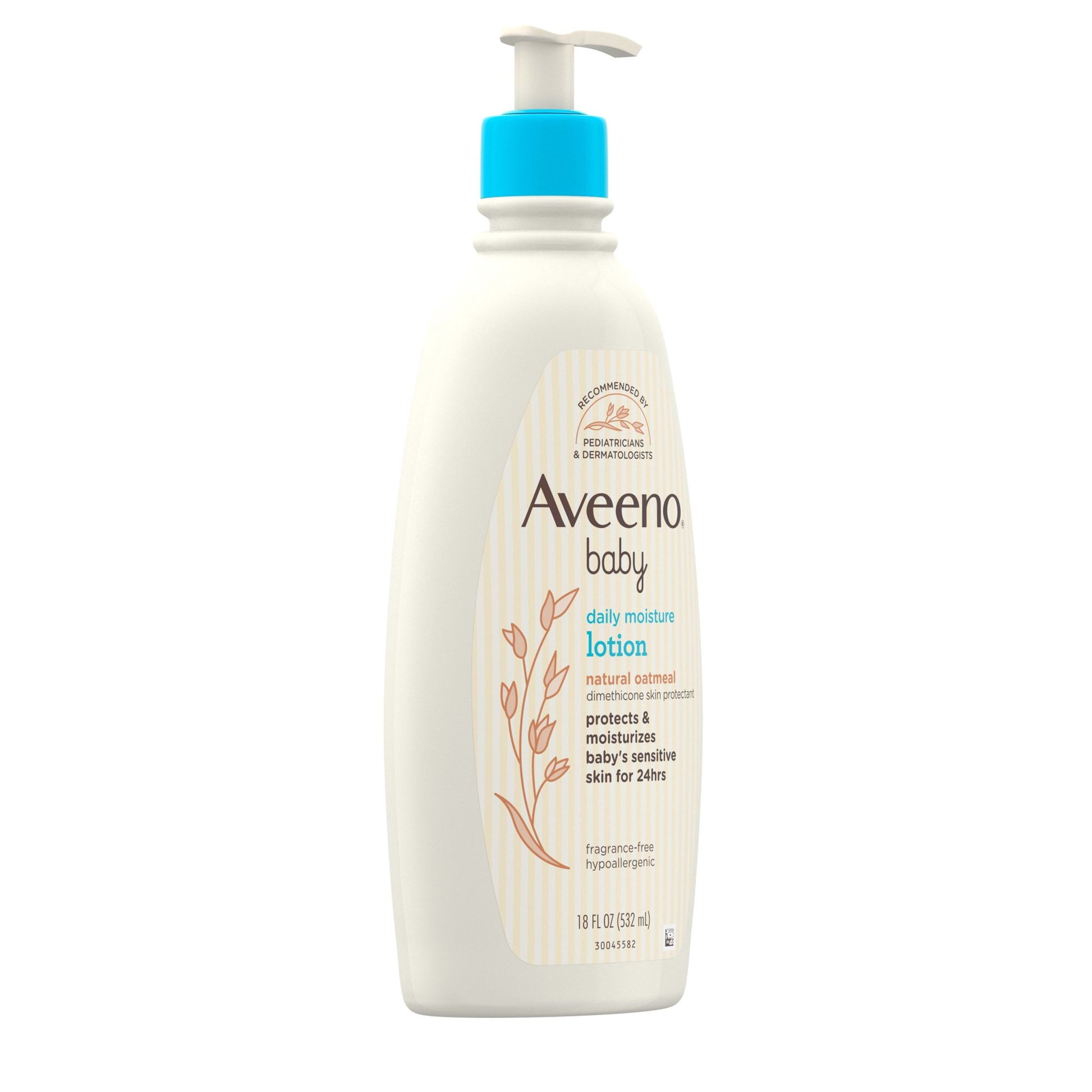 Aveeno Baby Daily Moisture Body Lotion with natural colloidal oatmeal features a nourishing, non-greasy formula that helps protect your little one's delicate skin and moisturizes for a full 24 hours. This nourishing baby moisturizing lotion is specially formulated to be gentle enough for babies. Natural colloidal oatmeal blended with dimethicone skin protectant allows this oatmeal baby body lotion to moisturize for a full 24 hours and helps prevent and temporarily protect chafed, chapped, or cracked skin. From a pediatrician-recommended brand, this hypoallergenic baby lotion can be used every day to keep your baby's skin soft, smooth, and healthy-looking. From Aveeno, a pediatrician and dermatologist-recommended brand, the non-greasy lotion formula is free from fragrance, parabens, steroids, phenoxyethanol and phthalates, so it won't irritate baby's sensitive skin.