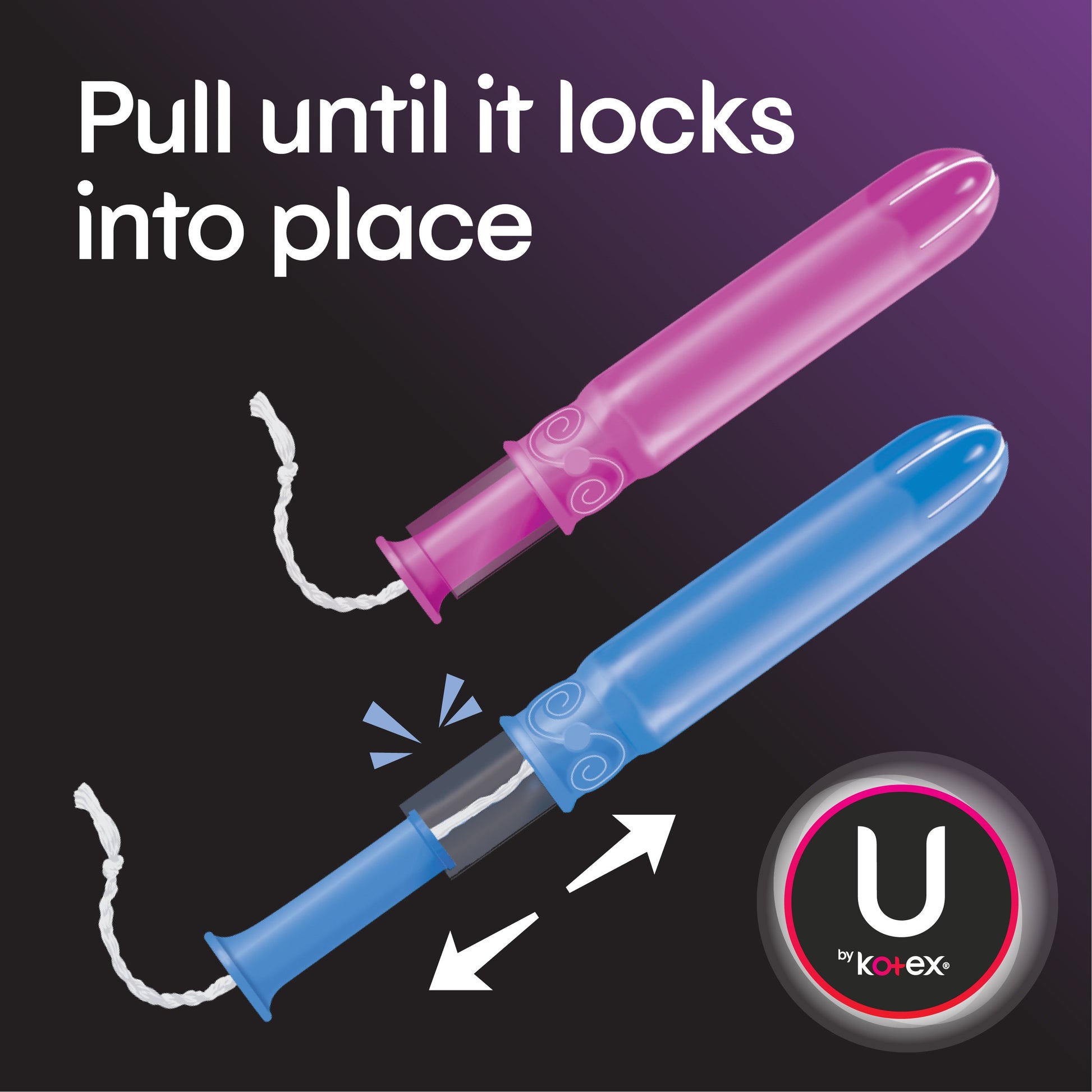Go from compact to full-sized protection in one quick move with U by Kotex® Click® Tampons. When you hear the click, it’s ready to go with a smooth tip for easy insertion. Perfect for travel and pocket-sized, to go where U go!